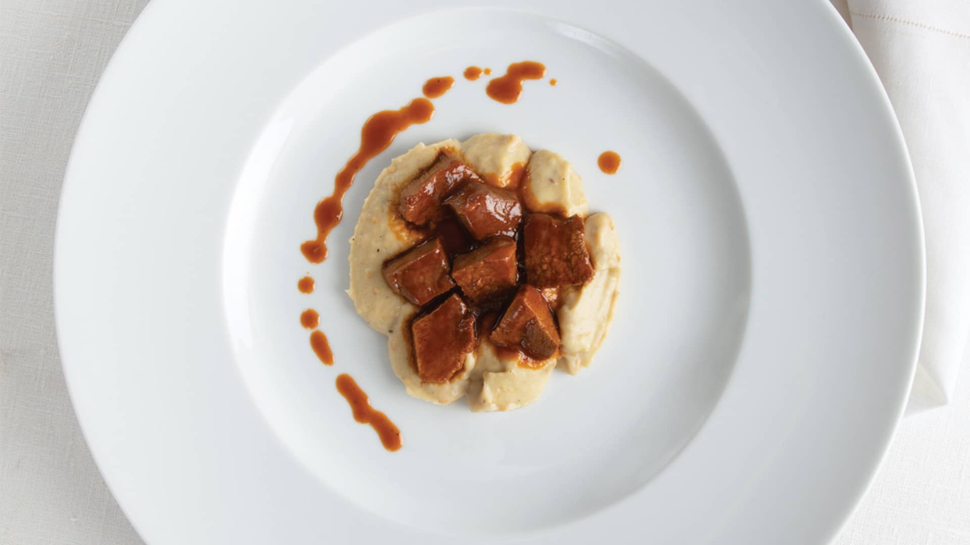 - Mash while whisking, add the salt and cook for 5 minutes. Add the cheese, remove from the heat and keep hot. Place the slow-cooked meat and the juices on top of the eggplant puree and serve.