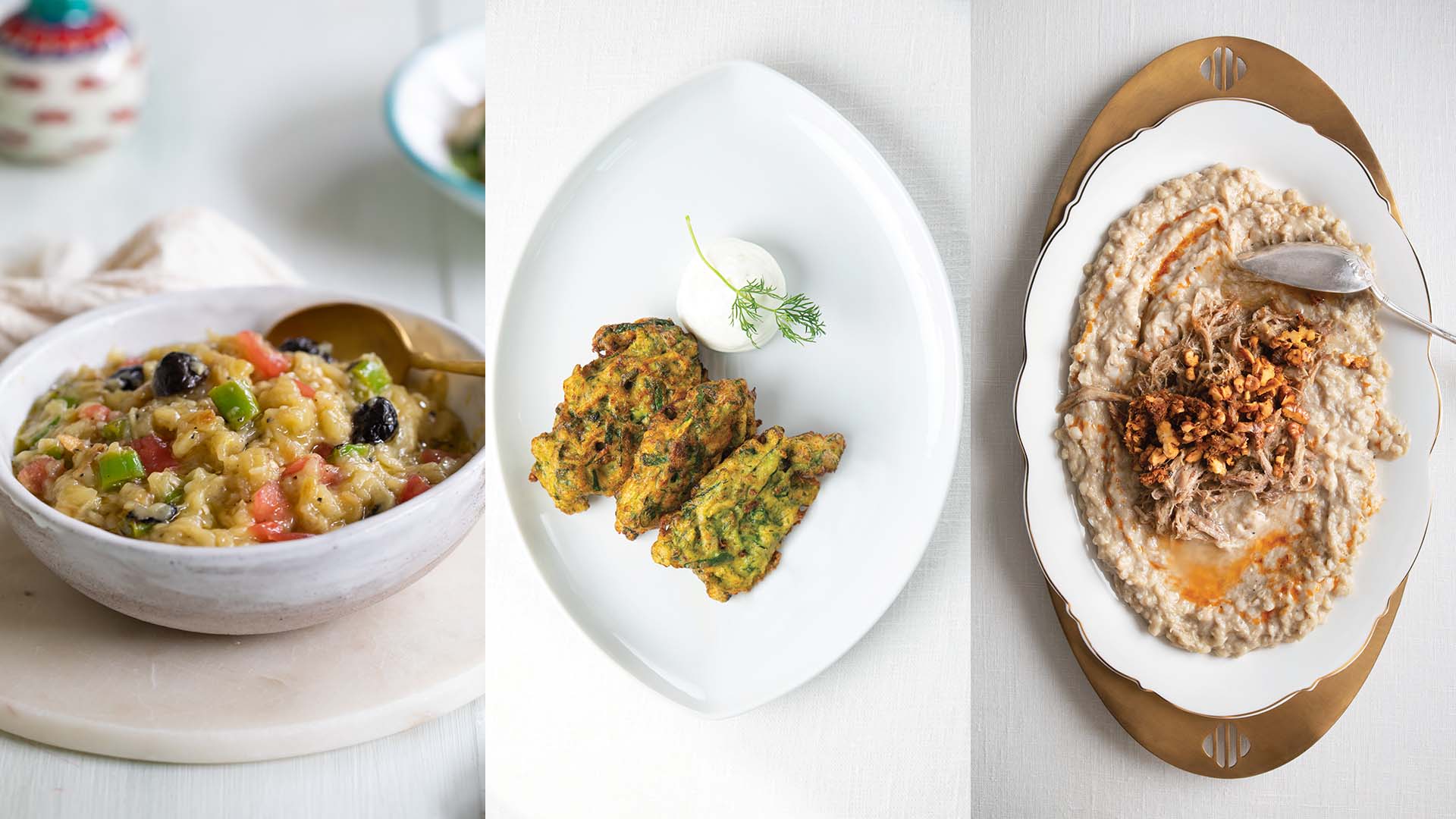 Meze tables are made up of a selection of very different foods, most of which are cold dishes that have been prepared earlier. There are also hot meze dishes that are prepared immediately and served at intervals. Hot stew dishes are not normally part of the meze table. In Turkey’s coastal regions fish, and in other regions sautéed diced lamb, grilled meatballs or kebab are served as main courses after the mezes. Cold mezes are the main food group of a meze table. Many of these need no cooking and consist of foods that can be served at the table any time. These mezes can be a slice of melon, a piece of white cheese, greens such as cucumbers, radishes, arugula/rocket, cress, tarragon and green onions/scallions, and when in season green plums, green almonds or pickled vegetables that can be served at the table instantly. Among cold mezes, seafood is also a great favorite. Fish roe, caviar, tarama (fish roe dip), lakerda (salted bonito), a variety of smoked fish, and also small pickled sardines or anchovies are mezes that can be served without further preparation. Some cold mezes require pre-preparation. In particular, olive oil dishes such as kidney beans, stuffed eggplants and stuffed vegetables in olive oil and some dishes made with pulses such as fava, hummus and white bean salad are all typical mezes in Turkish cuisine. The list of cold meze dishes may vary according to the region. In the Aegean region, for example, mezes based on fresh herbs prepared with olive oil and lemon juice are more popular, whereas in the Southeastern region spicy meze dishes including muhammara (crushed walnuts, stale bread, tahini, olive oil, garlic and lemon juice) and acılı ezme (spicy hot tomato salad dip) are more popular.