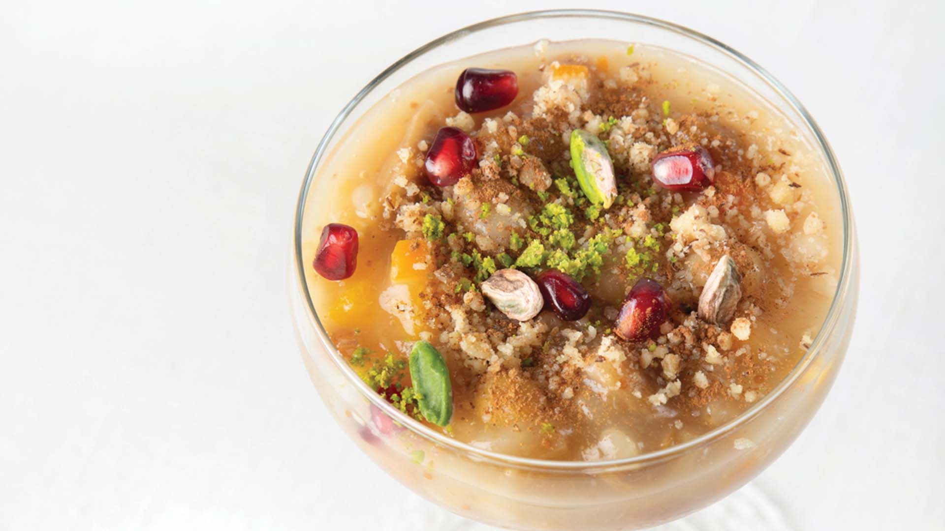 Ashura is a kind of sweet food traditionally made on the 10th day of the month of Muharram, which is the first month in the Islamic calendar. It is a symbol of abundance. It is made in large quantities and shared with neighbors, friends, and relatives. The main ingredient of Ashura is wheat. According to different beliefs, the number of ingredients can be seven, twelve, or even forty-one different kinds. This is garnished with currants, pine nuts, walnuts, and pomegranate seeds. Ashura, with its variety of ingredients is associated with the legend of Noah, and has always been referred to as Noah's pudding in foreign sources. The tradition of Ashura survives with all its vitality today, and is also a popular dessert found in muhallebi shops all year round.